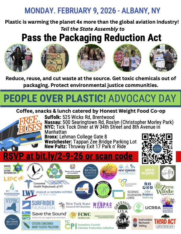 The New York State Legislature opened its 2026 session yesterday. Our priorities are to pass the Packaging Reduction and Recycling Act (PRRIA) and the Better Bottle Bill (BBB) during this legislative session. To that end, Beyond Plastics has organized an Advocacy Day on February 9. Advocacy Days are always exciting and inspiring. Speak to your legislators and make new friends! Our Planet Cannot Wait!